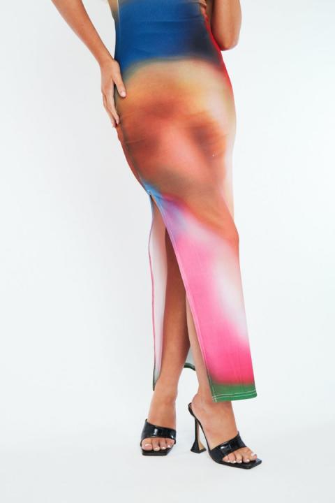 Multi Blur Printed Maxi Dress Get your next statement look with our Multi Blur Printed Maxi Dress. Including trending blur print, rib fabric and side slits. Pair with a vibrant bag or heels to complete the look. Multi Blur Print Maxi Dress Model wears size 8