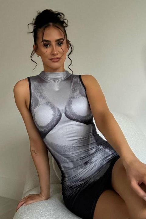 Grey Body Print High Neck Mini Dress Nail the new season trend in our Grey Body Print High Neck Mini Dress . Featuring a soft jersey fabric, body print, high neck, sleeveless, bodycon fit & a mini length. Wear with heels and soft curls for a cute summer look. GreyMini DressBody PrintHigh NeckBodycon FitMini LengthModel wears size 8
