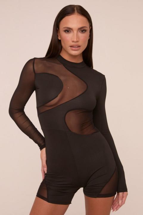 Rebellious Fashion Playsuits | WOMENS Black Mesh Panel High Neck Long Sleeves Playsuit – Adelaine