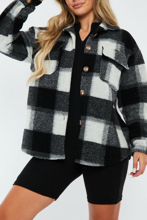 Black Checked Brushed Pocket Front Shacket Step up your insta look game with our Black Checked Brushed Pocket Front Shacket. Details include brushed material oversized, front pockets. Style with jeans and boots. Black Pocket Front Brushed Shacket Model wears size O/S